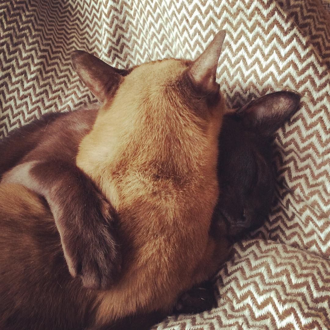 An instagram picture: #Burmese #cats wrapped up in each others’ arms.