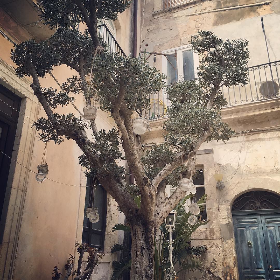 An instagram picture: Cloud-pruned olive in courtyard of Palazzo Borgia in Siracusa. Never seen it done before to an olive. #Niwaki #trees