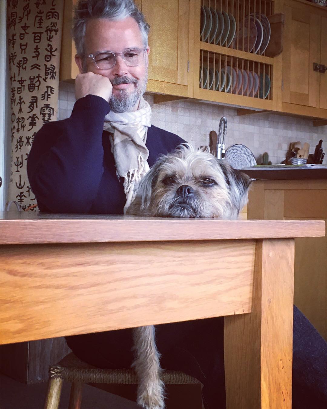 An instagram picture: #dog #man #calligraphy Quiet time.