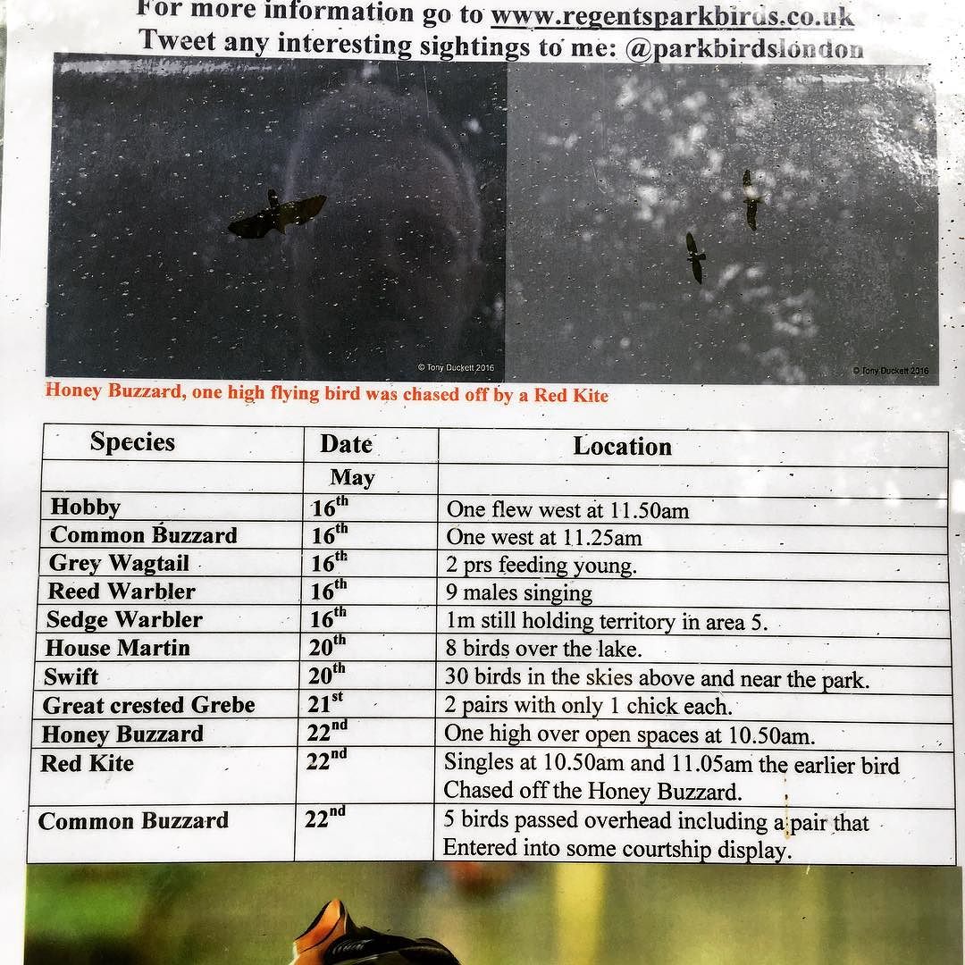 An instagram picture: Look at this collection of #birds in #regentspark in #centrallondon. A hobby, red kites, a honey buzzard — I never knew those were seen in southern England let alone central London. Wonderful.