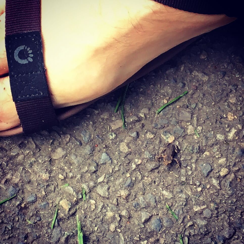 An instagram picture: Tiny tiny #frog next to my foot. They migrate from spawning grounds in lake then go and live in the long grass until Theresa May finds them and sends them back…