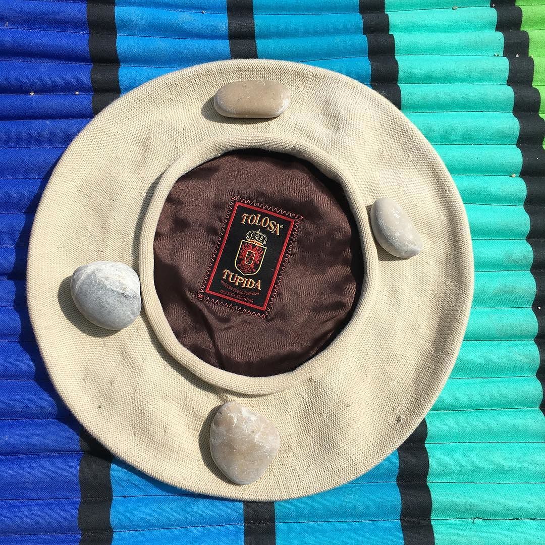 An instagram picture: So the wind doesn’t blow it all away. #tomwaits #beret #beach