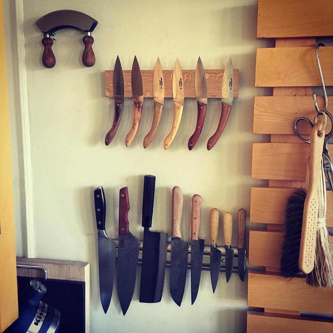 An instagram picture: I put up my new magnetic wooden knife rack today and hung up all the beautiful #Ariegois #knives I bought recently in the Pyrenees. Below them are my “hands off, mine only” knives not to be used by the inexperienced or careless!