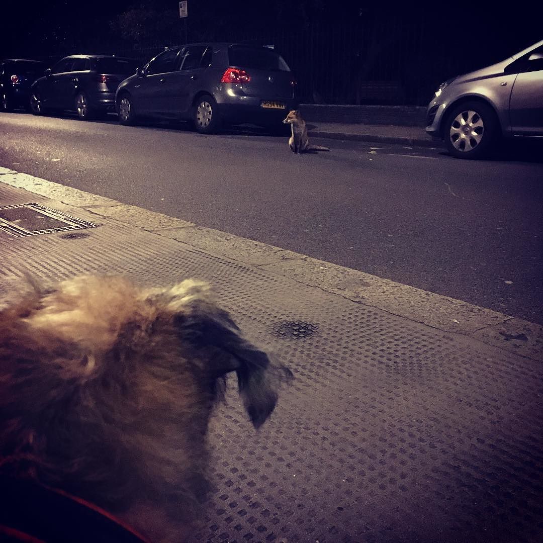 An instagram picture: Stan loves to talk to his friend, the fox cub, of an evening. Pretty one-sided: Stan beeps and shrills like R2D2; Mr Fox follows at a discreet distance behind the railings and then occasionally emerges for a closer look. #urbanwildlife