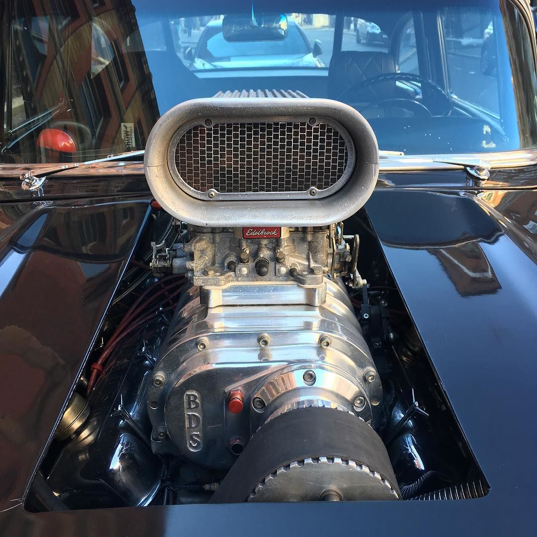 An instagram picture: Blower on a ?56 Chevy Belair in central London #musclecars