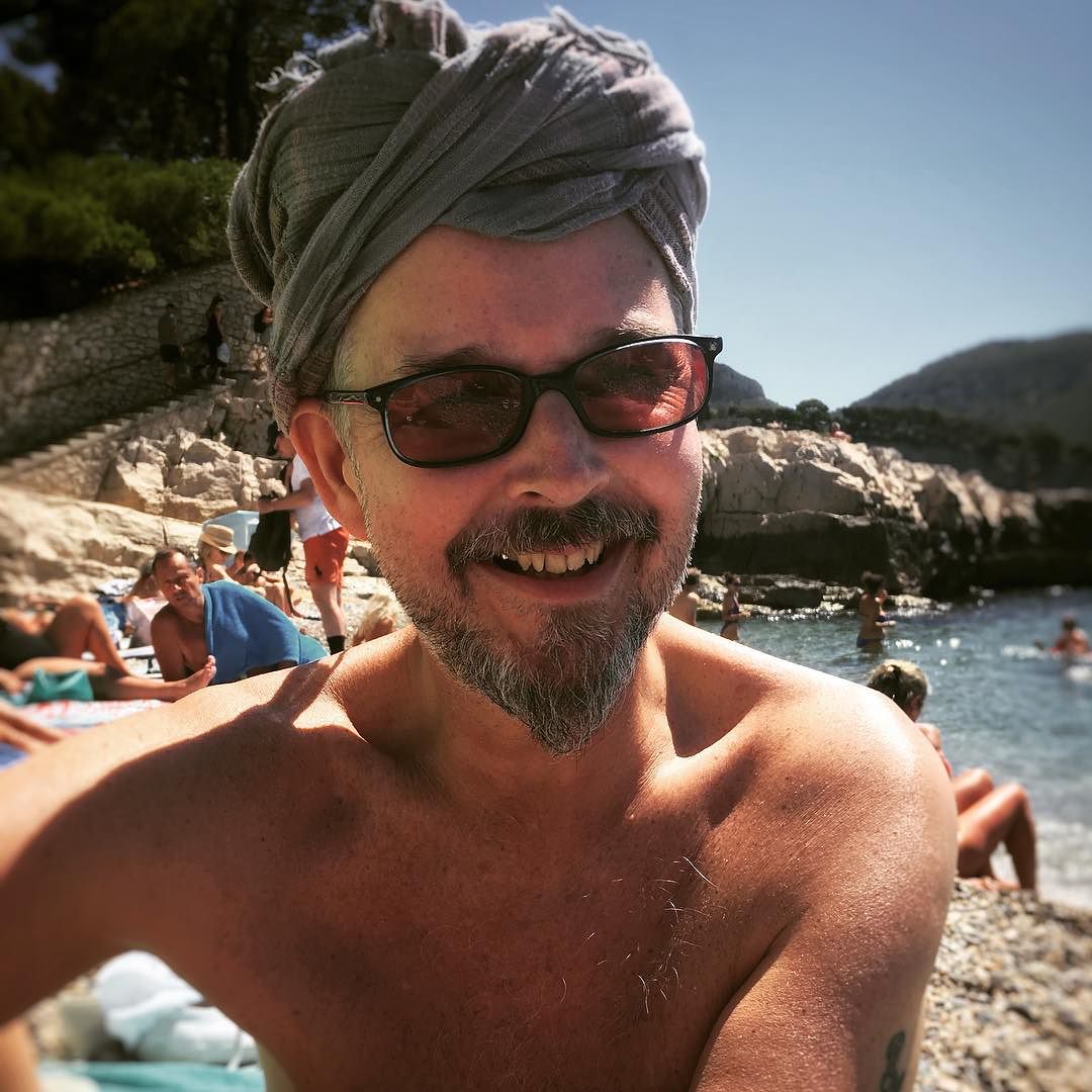 An instagram picture: On the beach with mad headdress. Cat said I looked like an Ingres odalisque. Er. Um. Well at least very happy ;-)