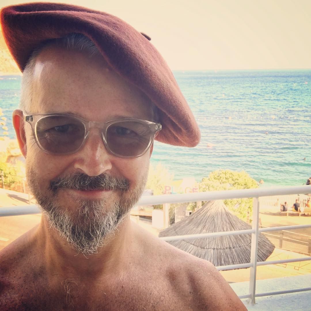 An instagram picture: #beards, #berets and #beaches. Great summer combination! This is No. 002 in the @bonetaire summer weight #aotearoa line–merino wool but lightweight enough for 28C here near #marseille. Wonderful rusty brown colour is mine. Very happy.
